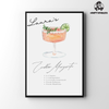Jedes Poster zeigt einen detailreichen, von Hand illustrierten Cocktail im Aquarell-Stil, ergänzt durch das passende Rezept zum Nachmixen. Der obere Bereich kann mit deinem individuellen Namen gestaltet werden – für eine ganz persönliche Note.