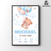 Feiere den schönsten Moment im Leben mit einem liebevoll gestalteten Poster zur Geburt. Unser hochwertiges Baby-Poster zeigt einen süßen Teddybären mit rosa Ballons in sanften Wolken – inklusive Name, Geburtsdatum, Uhrzeit, Gewicht und Größe des Neugeborenen.